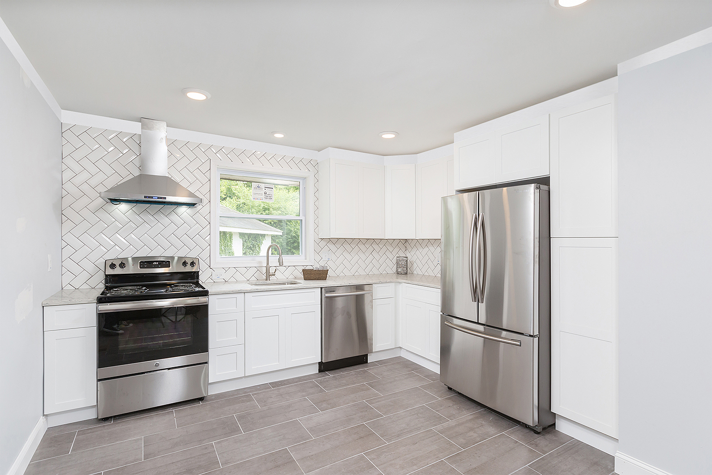 Designers usually prioritize white paint to brighten a gloomy space. White cabinets, white counters, and white tiles help lighten the room.